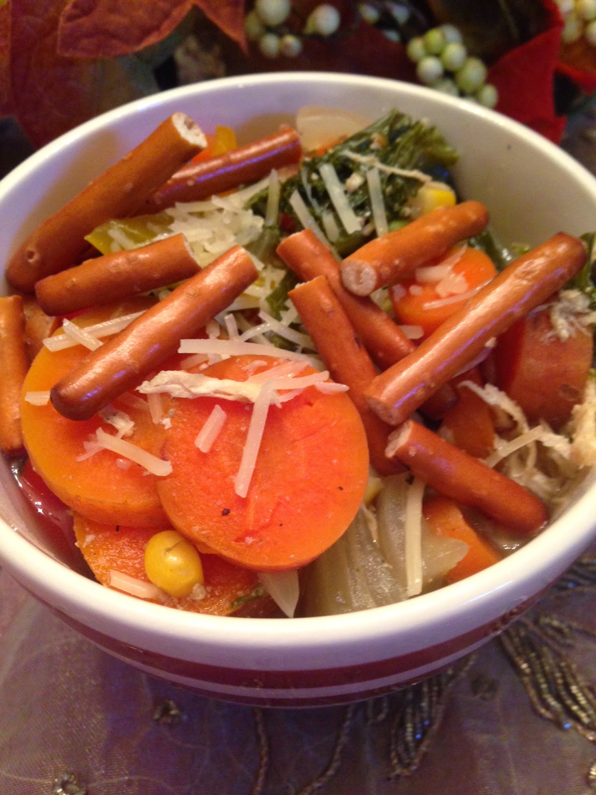 We didn't have crackers in the house but I found a bag of gluten-free pretzels which I figured should work well enough. Why we had gluten-free pretzels in the pantry at all I don't have the slightest clue since no one is gluten intolerant. Regardless of where they mysteriously came from, they were great with the soup!